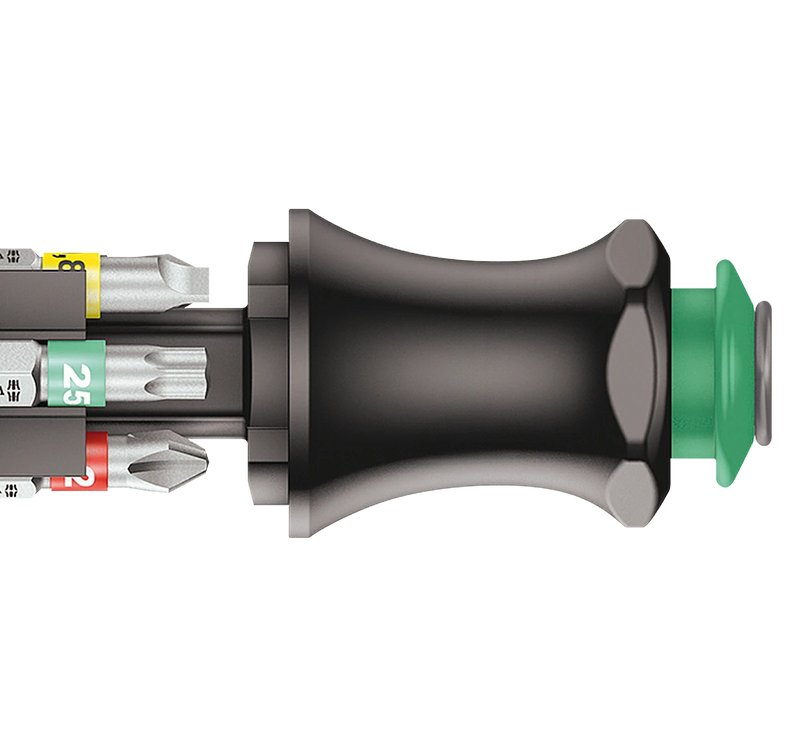 With the screwdriver bit magazine set from Wera, you are ideally equipped for all screwdriving jobs. Thanks to the multi-component Kraftform handle with integrated magazine, you always have the right bits to hand - and all in a compact, robust pouch. The bayonet blade can be retracted into the handle so that you can work flexibly. With the Rapidaptor quick-change chuck, you can change bits in no time at all. The ‘Take it easy’ tool finder with colour coding ensures that you can quickly find the right bit. This set saves space and replaces an entire set of screwdrivers!
