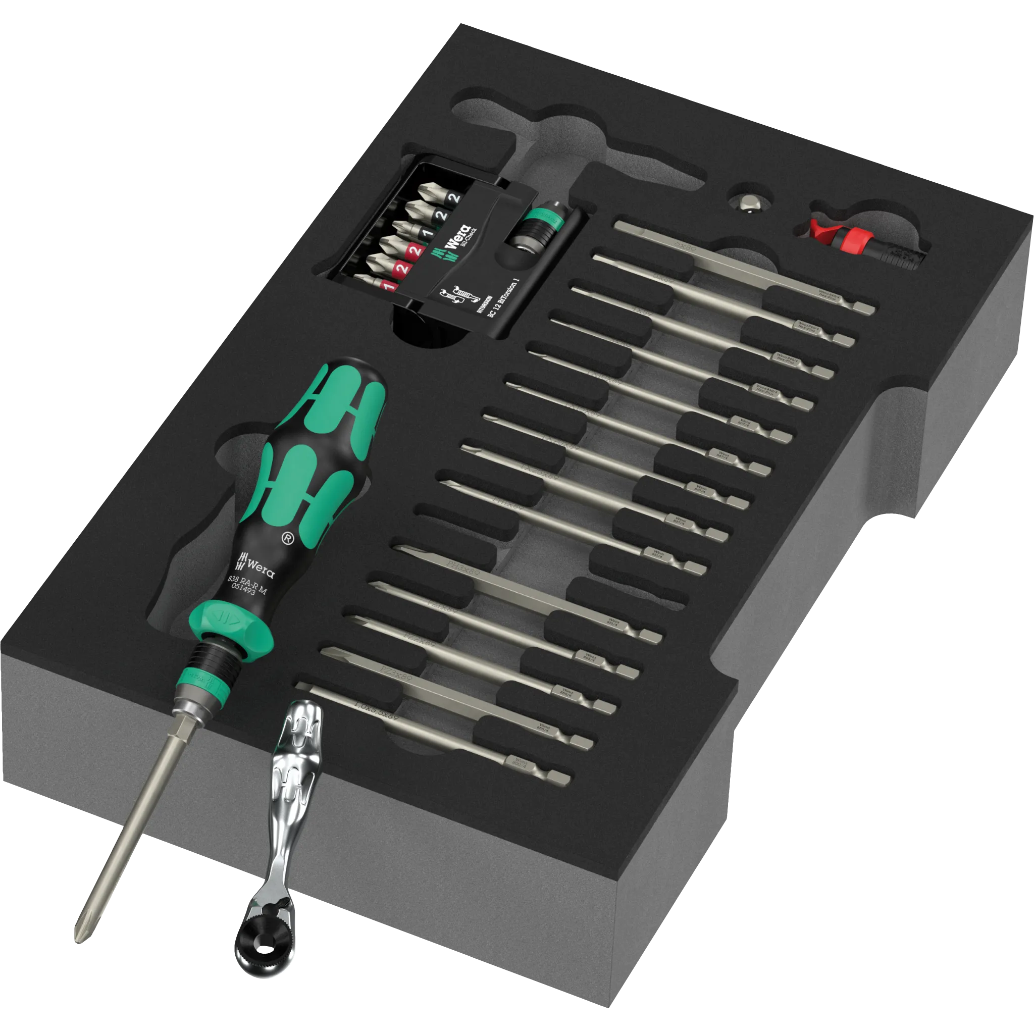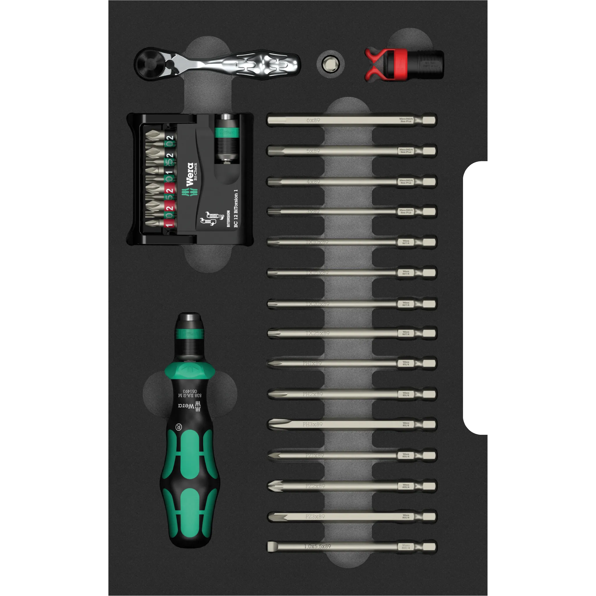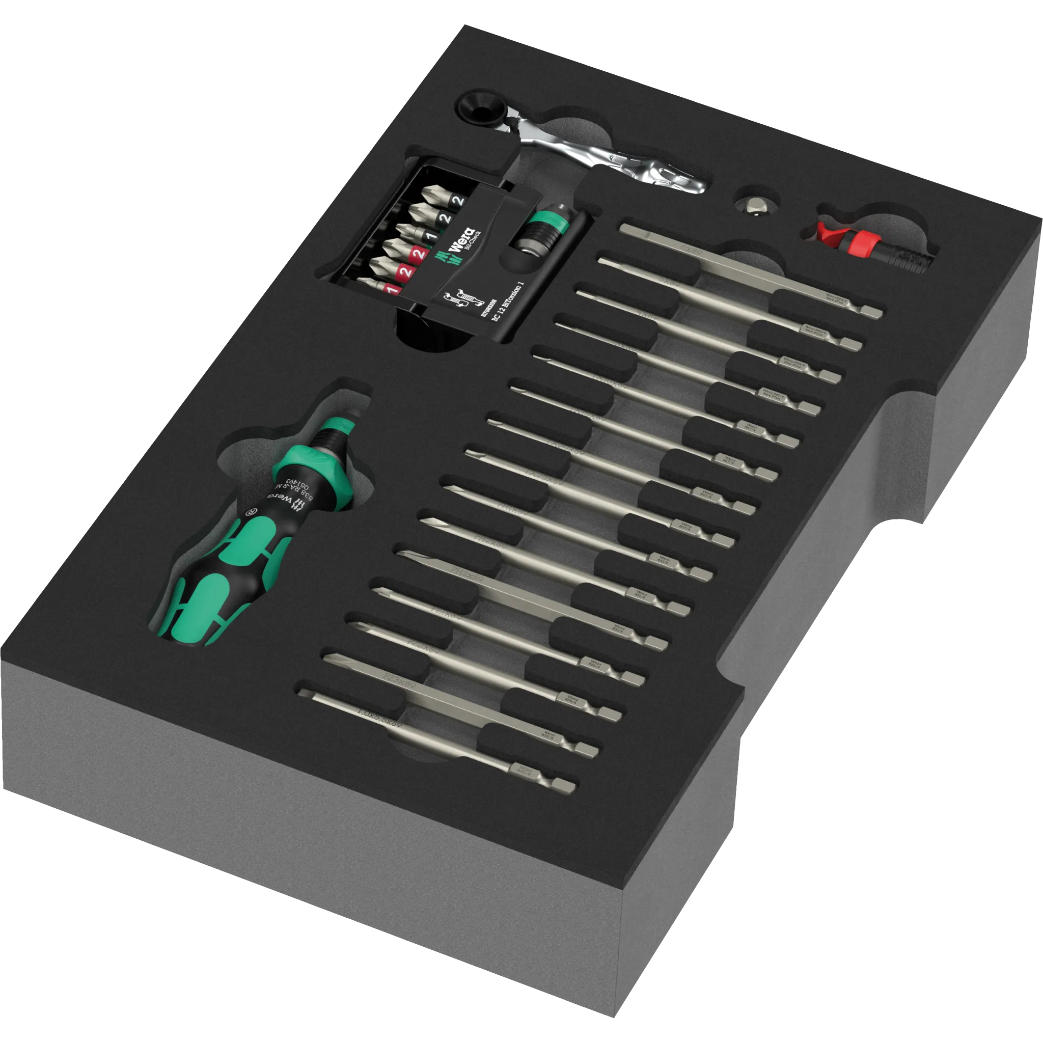 The Screwdriver Interchangeable Blades Set in Inlay combines flexible interchangeable blades with a ratcheting handle for tight spaces and steady control. The Bit-Check covers common profiles, while the Zyklop Mini bit ratchet adds speed when clearance is limited. With the Rapidaptor quick-change chuck, you swap bits in seconds and use them by hand or with your drill/driver. Everything sits well organised in the foam inlay, ready for your workshop, service jobs or home projects. Compact, durable and unmistakably Wera – for clean results without fuss.