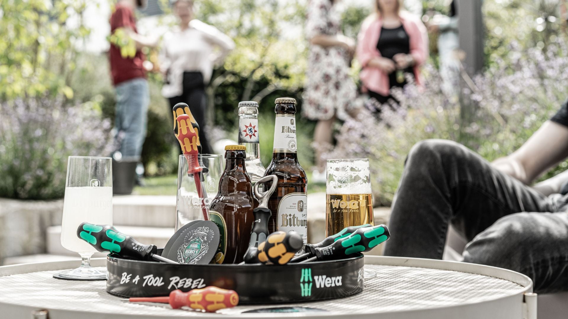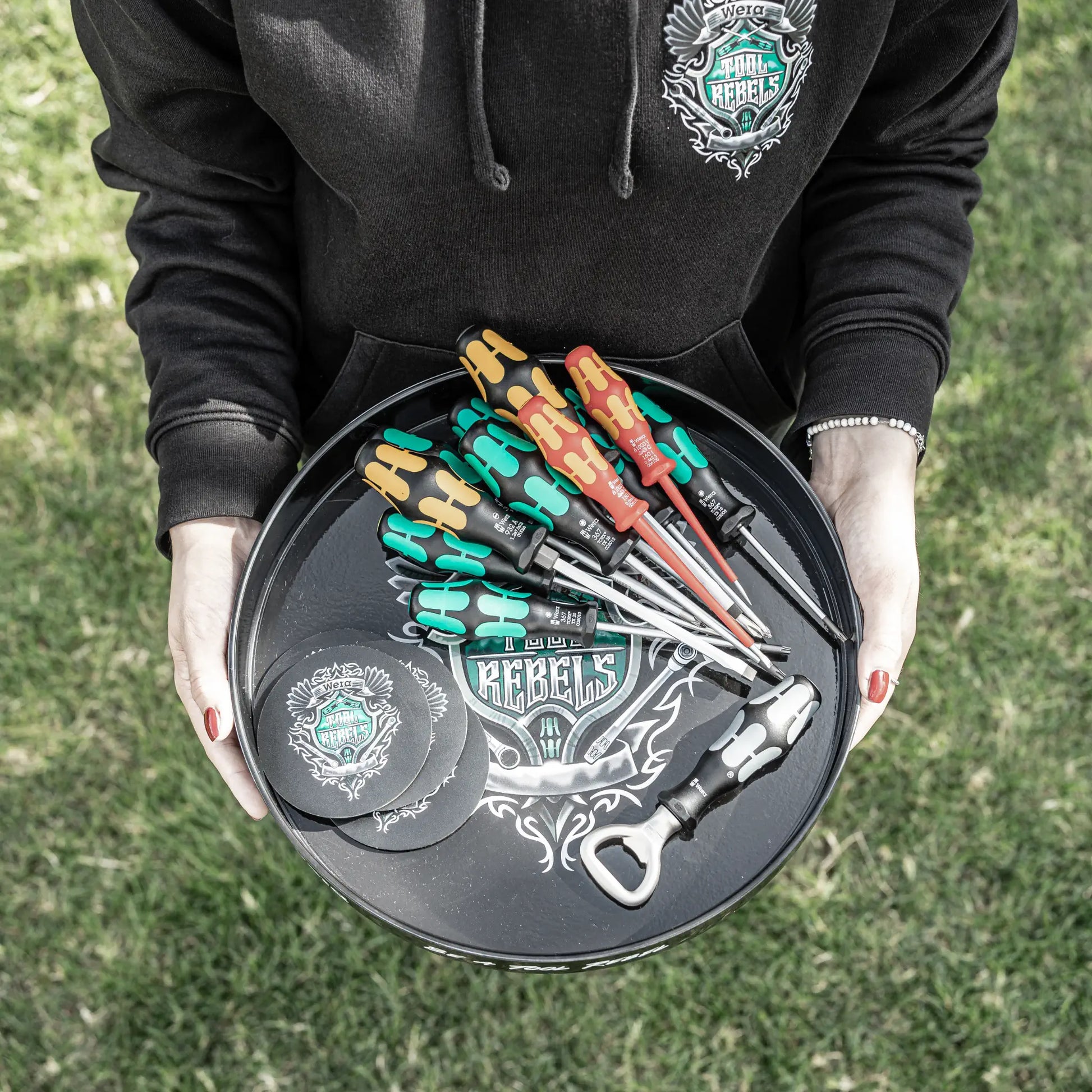 You get the Wera serving tray, which is already almost a collector's item and actually the only acceptable way to transport your drinks in style. A real eye-catcher at any party. With the rebellious Tool Rebel logo and a robust design, it is both practical and ideal for impressing your guests.