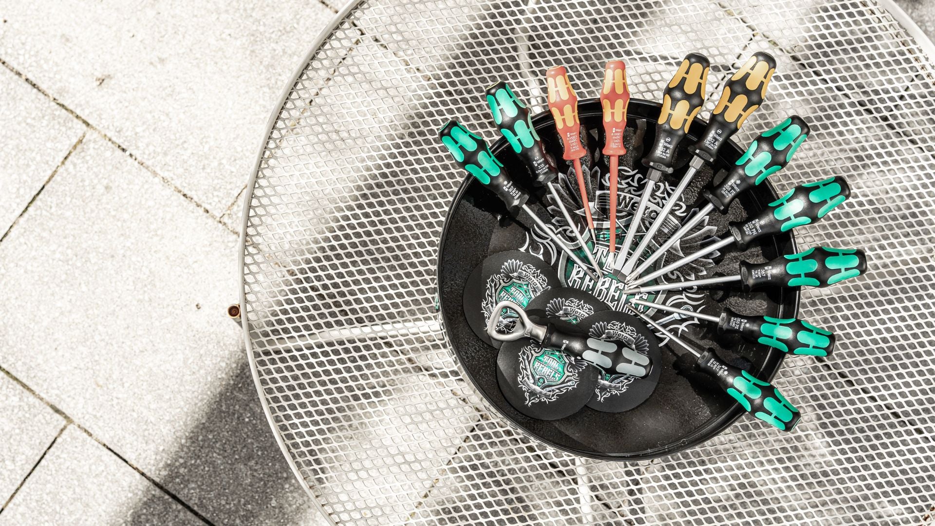 Of course, two things should not be missing from a party set from Wera: Firstly, the mandatory bottle opener. We have included our Wera bottle opener in Tool Rebel design in this set. Secondly, of course, the actual tools must not be missing! We have made a careful selection and you will enjoy the ergonomic Wera Kraftform handles.