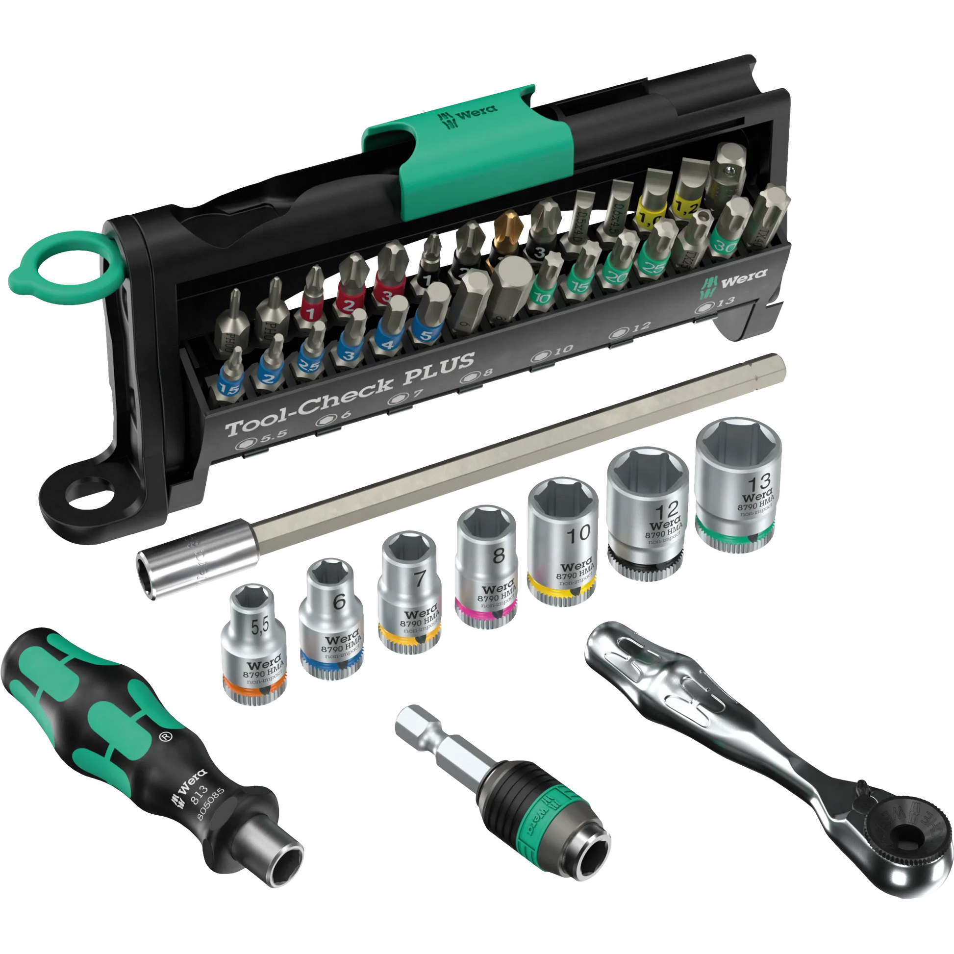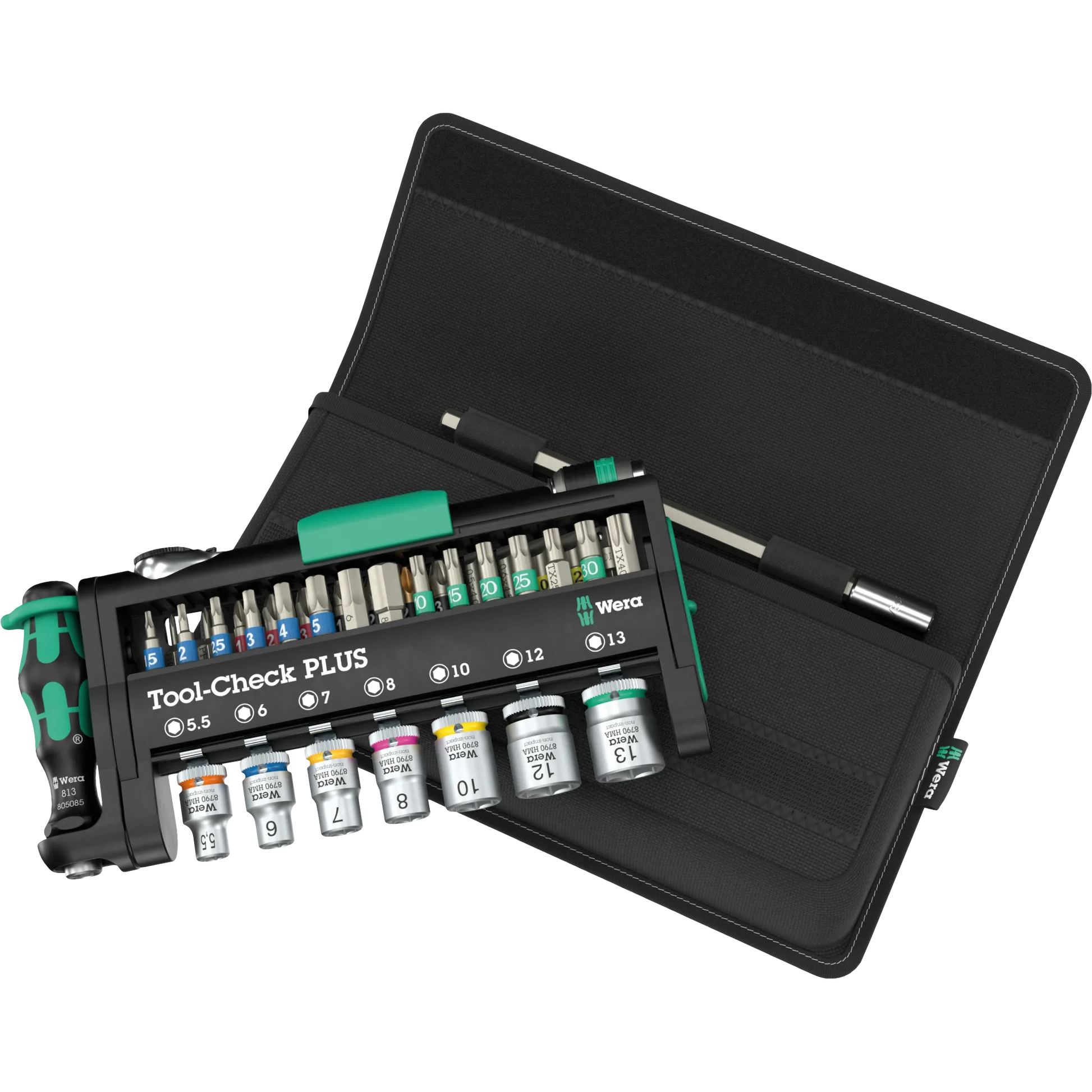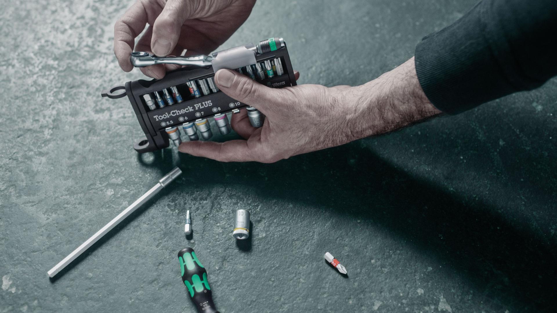 The Tool-Check PLUS in the Tool Rebel edition is an absolute space wonder.40 screwdriving tools find their place in a practical holder that can be stowed in most trouser pockets. In addition to the robust 1/4 inch ratchet and the practical Kraftform bitholding screwdriver, the set also impresses with a colorful mix of high-quality bits and socket.